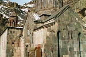 The monastery of Geghard was named after its most famous religious artifact, the lance that was said to have pierced the side of Christ. The complex has several cave-like buildings carved from solid granite.