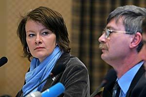 ODIHR Spokeswoman Urdur Gunnarsdottir (left) and Amb. Lubomir Kopaj, Head of the ODIHR Election Observation Mission to Kyrgyzstan, at a press conference in Bishkek, 28 February 2005.