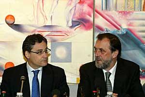 Serbia and Montenegro Foreign Minister Vuk Draskovic (right) and OSCE Mission Head Maurizio Massari during discussions on the opening of files of the secret services in Serbia and Montenegro, Belgrade, 5 March 2005.