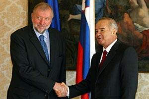 OSCE Chairman-in-Office Dimitrij Rupel (left) meets President of Uzbekistan Islam Karimov in Brdo near Kranj, 17 March 2005.
