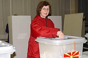 A voter casts her ballot at a polling station in Skopje during municipal elections in the former Yugoslav Republic of Macedonia, 13 March 2005.