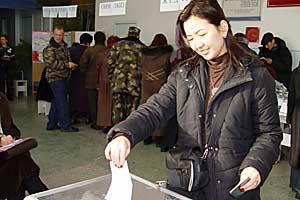 A voter in Bishkek casts her ballot during parliamentary elections in Kyrgyzstan, 27 February 2005.