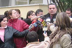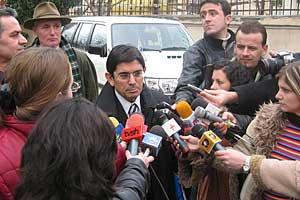 Jemin Gjana of the Democratic Party talks to journalists after initialling an agreement with the Socialist Party on redrawing Albanian electoral zones, at the OSCE Presence premises in Tirana, 28 February 2005.