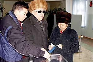 A young man helps a blind voter cast his ballot during parliamentary elections in Kyrgyzstan, 27 February 2005.