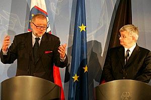 OSCE Chairman-in-Office Dimitrij Rupel (left) and German Foreign Minister Joschka Fischer speaking to the press in Berlin, 18 January 2005.