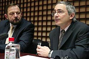 Branislav Bjelica, Serbian Deputy Justice Minister (left), with Douglas Wake, Deputy Head of the OSCE Mission to Serbia and Montenegro, at an expert discussion on asset seizure and the rule of law organized by the OSCE in Belgrade, 18 February 2005.
