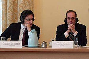 Head of Mission Maurizio Massari (left) and OSCE Representative on Freedom of the Media Miklos Haraszti at the roundtable Criminal Provisions on Insult and Libel, organized by the OSCE in Belgrade, 24 January 2005.