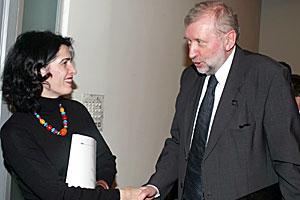 OSCE Chairman-in-Office Dimitrij Rupel greets Eliza Moussaeva, one of a number of NGO representatives whom he met after addressing the OSCE Permanent Council in Vienna on 13 January 2005.