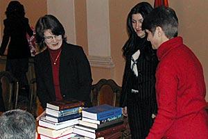 Deputy Head of Office Elaine Conkievich (left) hands over books to the librarian of the National Assembly, Yerevan, 28 December 2004.
