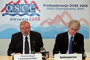 Slovenian Foreign Minister and OSCE Chairman-in-Office Dimitrij Rupel talks to the press after his first address to the OSCE Permanent Council in Vienna, 13 January 2005. On the right is OSCE Spokesperson Richard Murphy.