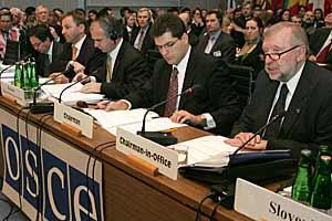 Slovenian Foreign Minister and OSCE Chairman-in-Office Dimitrij Rupel (right) addresses the OSCE Permanent Council in Vienna, 13 January 2005.