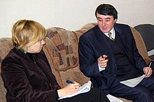 ODIHR Migration Officer Nadzeya Zhukava (left) discusses the situation of migrant workers in Russia with Ibragim Abdulaev of the Tajik Labour Ministry in Yekaterinburg, Russia, December 2004.