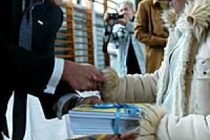 Head of the OSCE Mission to Serbia and Montenegro, Maurizio Massari, hands out notebooks "My house is in Europe" to first-graders in Vojvodina, 8 November 2004.