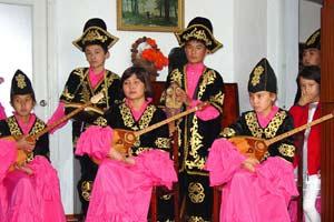 Dressed in traditional costumes, children perform in the remote village of Zhobagly in south Kazakhstan. Picture taken 2004.