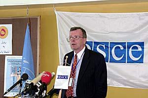 Ambassador Robert Barry, head of the OSCE Election Support Team to Afghanistan, briefs journalists in Kabul, 4 October 2004.