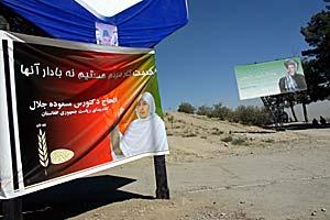 Election posters showing Afghanistan interim President Hamid Karzai (r.) and the only female candidate, Massouda Jalal, in Kabul, 5 October 2004.