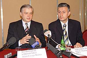 Polish Foreign Minister Wlodzimierz Cimoszewicz (left) met with OSCE Chairman-in-Office Solomon Passy at a press conference in Warsaw, 4 October 2004.
