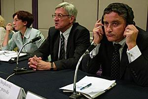 R-to-L: Head of OSCE Mission to Serbia and Montenegro, Maurizio Massari, Justice Minister Zoran Stojkovic and Supreme Court Judge Vida Petrovic Skero at a public discussion on the Draft Law on Civil Procedure, Belgrade, 10 September 2004.