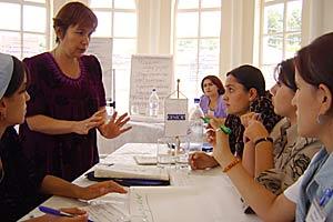 Tajik journalists discuss challenges they face when reporting on human trafficking, during a training course organized by the OSCE in Kulyab, 22 July 2004.