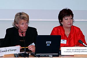 Maud de Boer-Buquicchio from the Council of Europe and Helga Konrad, OSCE Special Representative on Combating Trafficking in Human Beings, speaking to the press in Vienna, 23 July 2004.