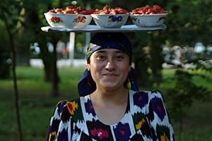 A Tajik woman sells strawberries in a central Dushanbe park.