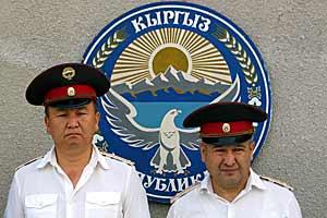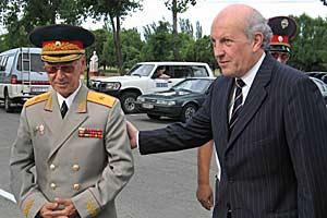 Richard Monk (right), the OSCE's Senior Police Adviser until January 2006, with former Kyrgyzstan Interior Minister before a graduation ceremony at the Police Academy in Bishkek, 26 June 2004.
