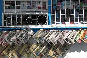 Newspapers on sale at a kiosk in the centre of Bishkek, June 2004.