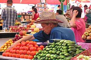 A vendor arranges vegetables on his stand at the central market in Bishkek, June 2004.