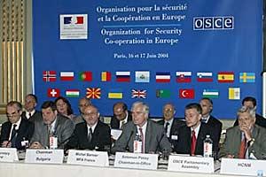 OSCE Chairman Solomon Passy with French Foreign Minister Michel Barnier (right), 16 June 2004 in Paris at an OSCE conference on hate crimes and racist, xenophobic, anti-Semitic propaganda on the Internet.