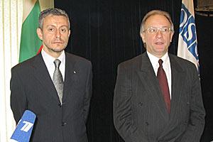 OSCE Chairman-in-Office, Solomon Passy (left), and Belarus Foreign Minister, Sergei Martynov, speak to the press in Minsk, 9 June 2004. It was the first visit of a Chairman-in-Office to Belarus in six years.