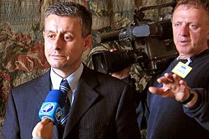 OSCE Chairman-in-Office, Bulgarian Minister of Foreign Affairs Solomon Passy, speaks to the press at the 12th OSCE Economic Forum, in Prague 31 May 2004.