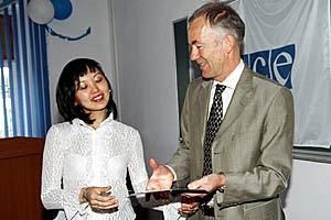 The Head of the OSCE Centre in Bishkek, Ambassador Markus Mueller, hands over a certificate to a student who has completed the first postgraduate course at the OSCE Academy in Bishkek, 5 June 2004.