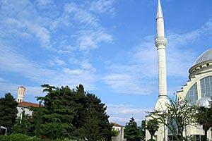 A mosque and a church side by side in Shkodra provide an illustration of religious tolerance in Albania, April 2004.
