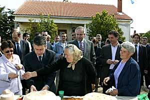 Serb returnees Jovanka Marcic and Sofija Skoric welcoming OSCE Chairman-in-Office Solomon Passy to their village of Biljane Donje with home-made bread, 11 May 2004.