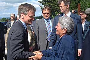 Head of OSCE Mission to Croatia, Ambassador Peter Semneby, greets a Serb returnee to the village of Biljane Donje, 11 May 2004.