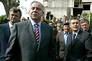 Croatian Foreign Minister Miomir Zuzul, Prime Minister Ivo Sanader and OSCE Chairman Solomon Passy (left to right) visit Serb returnees near Zadar and view reconstruction efforts in the region, 11 May 2004.