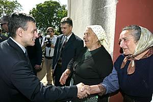 OSCE Chairman-in-Office Solomon Passy (left) and Croatian Prime Minister Ivo Sanader meet Serb returnees, Zadar hinterland, 11 May 2004.