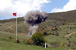 A controlled explosion- destruction of munitions, including land mines, collected under the OSCE Mission to Georgia Rapid Reaction programme in the zone of the Georgian-Ossetian conflict, 29 April 2004.