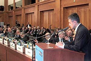 The OSCE Conference on Anti-Semitism ended with a joint press conference by Chairman-in-Office Solomon Passy (left) and German Foreign Minister Joschka Fischer, Berlin, 29 April 2004.