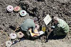 Engineers prepare for destruction mines collected under the OSCE Mission to Georgia Rapid Reaction programme in the zone of the Georgian-Ossetian conflict, 29 April 2004.