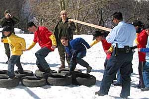 Children from a range of ethnic communities participating in a non-competitive sports event in Brezovica/Brezovice. The project was carried out by the OSCE Mission in Kosovo together with Kosovo Police, local sports teachers and US KFOR, March 2004.