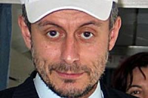 OSCE Chairman-in-Office, Bulgarian Foreign Minister Solomon Passy wearing a baseball hat with the OSCE logo on board a plane en-route to the Caucasus, 14 March 2004.