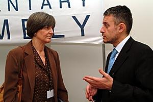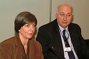 OSCE PA President Bruce George listens to Ann Cooper, Executive Director of the Committee to Protect Journalists, which was awarded with OSCE's 2004 Journalism and Democracy Prize, Vienna, 19 February 2004.