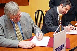Head of the OSCE Mission, Roy Reeve (left) and Georgian Finance Minister Zurab Nogaideli sign the agreement of OSCE's 1-million-euro contribution for Georgia's general elections, 17 February 2004.