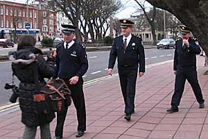 Croatian Police Officers Silvio Bratkovic (right) and Marjan Zuvljevic (middle) on patrol with OSCE Community Policing Adviser Paul Richardson (left) in Brighton City, England.