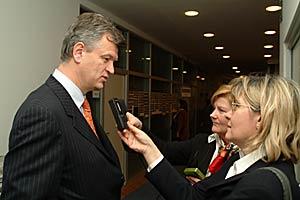 Croatian Foreign Minister Miomir Zuzul talks to journalists after addressing the OSCE Permanent Council, 16 February 2004.