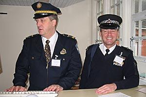 OSCE Community Policing Adviser Paul Richardson (right) with Croatian Police Officer Marjan Zuvljevic (left) at a simulated police station in Sussex for practical role-plays, where Zuvljevic learned UK community policing techniques.