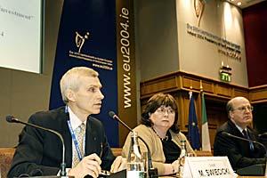 Irish Deputy Prime Minister Mary Harney listens to Marcin Swiecicki, Co-ordinator of OSCE Economic and Environmental Activities (left), at the OSCE's Dublin Seminar on Stimulating Foreign and Domestic Investments, 16 February 2004.