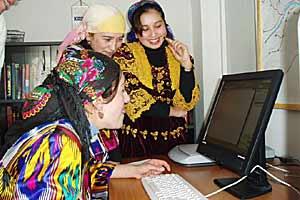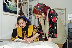 Three young women exploring resources offered at the first youth information centre in the Rasht Valley region of Tajikistan, 6 February 2004.