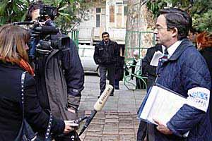 ODIHR Director Ambassador Christian Strohal speaks with a reporter from the Reuters news agency during the presidential election in Georgia on 4 January 2004.